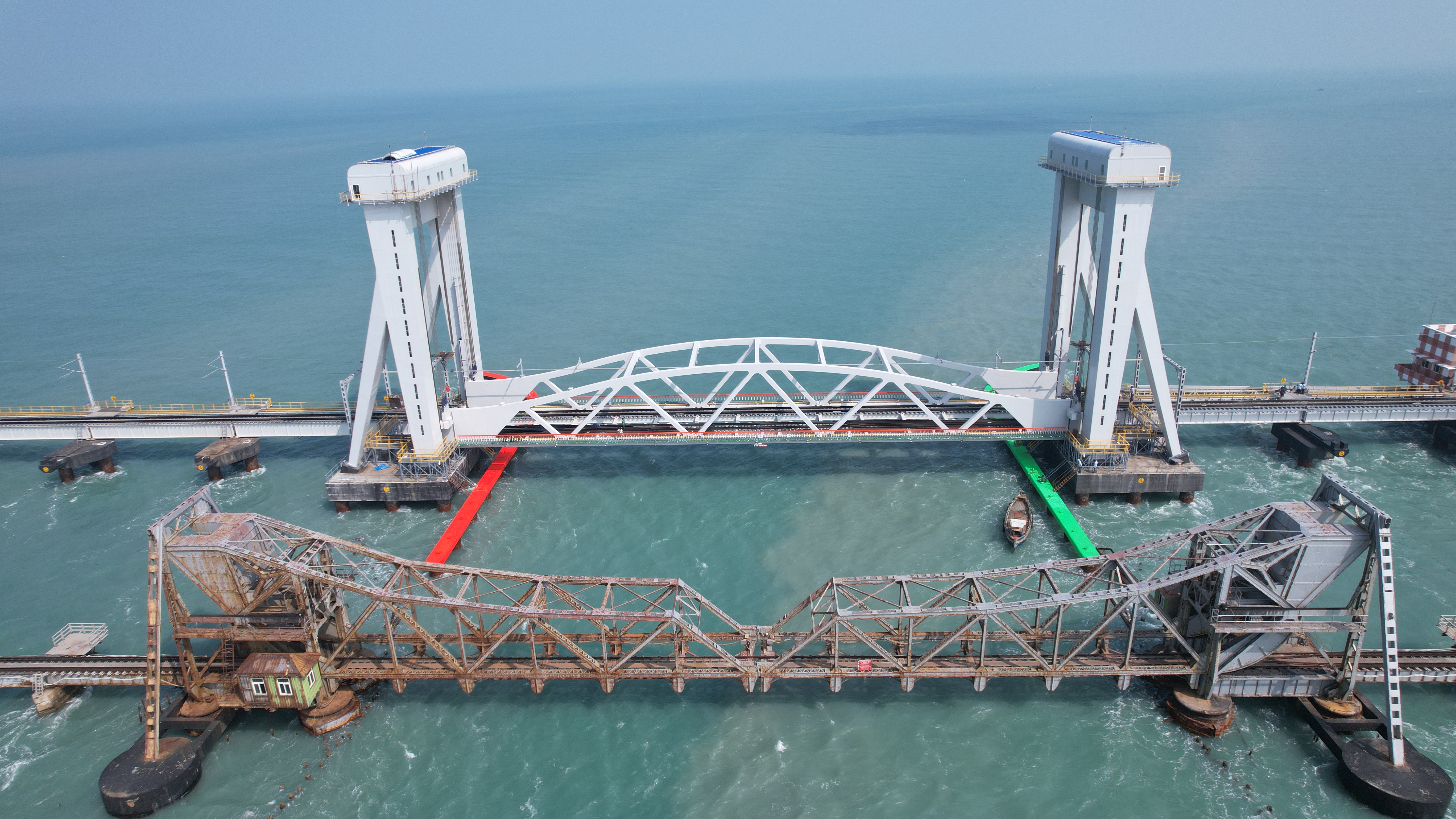 THIS IS THE ICONIC BRIDGE OF INDIA, THE SPAN OF 77.1 M WILL BE LIFTED FOR BOATS TO CROSS THE BRIDGE AS IT IS SITUATED IN BETWEEN MAIN LAND OF INDIA AND PAMBAN ISLAND.